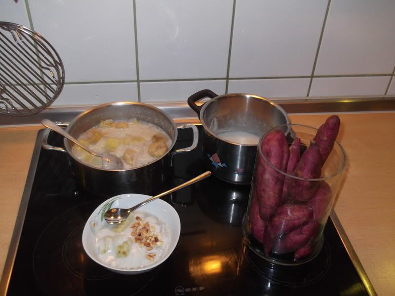 Vậy thì mời Anh Văn thưởng thức món bánh khoai lang , bánh chuối , bánh táo mà mén mới chiên nè nha . Lát chờ mấy nhỏ bạn tới , mén bầy cho ăn chung với kem nữa cơ . Không có gì thích bằng , bên ngoài tuyết rơi rơi , bên trong nhà ngồi nhấm nháp thìa kem ngập sữa , ngon ơi là ngon lun ...hi hi