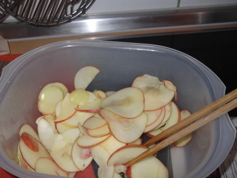 Trước tiên cắt táo cho mỏng , ngâm với đường và xíu muối khoảng 30-60 phút