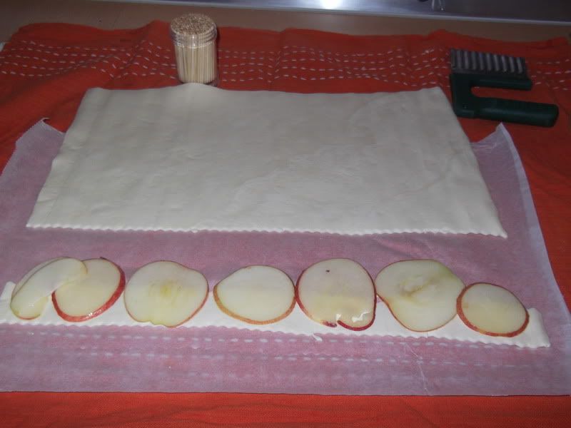 Cắt bánh ra , rồi xếp táo dzô , giống như vầy nè .